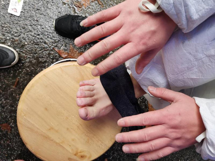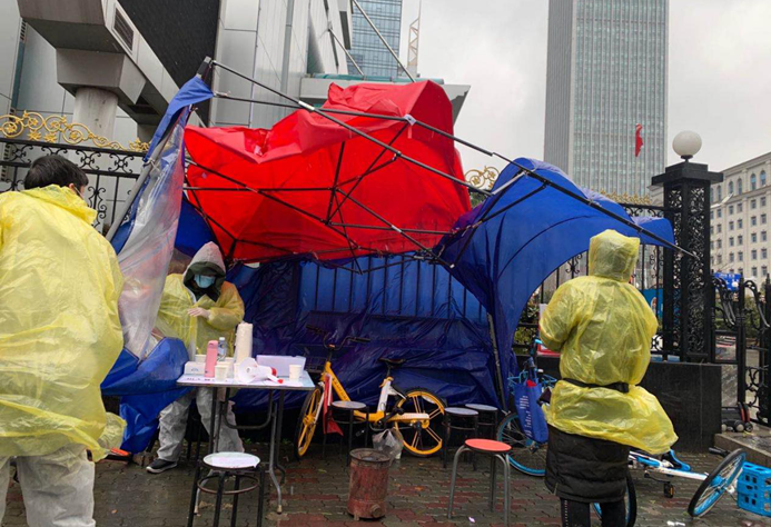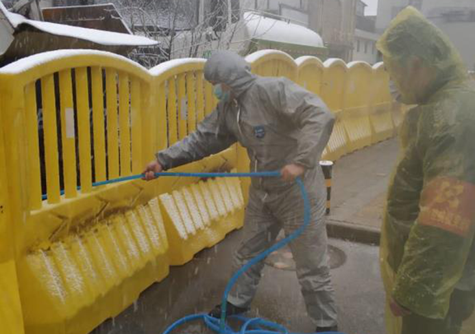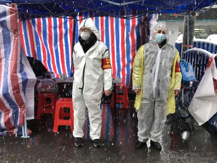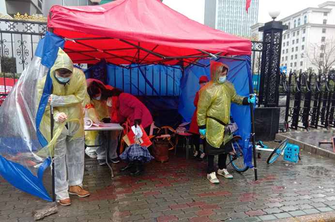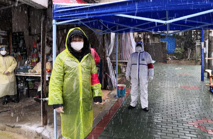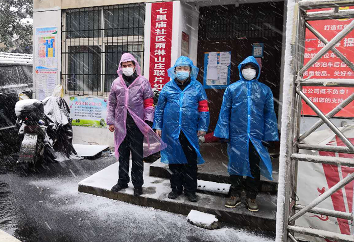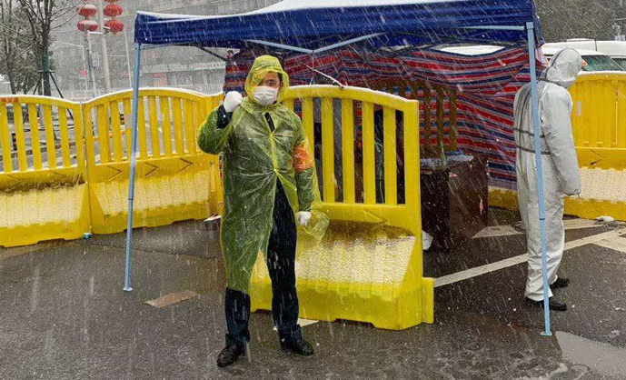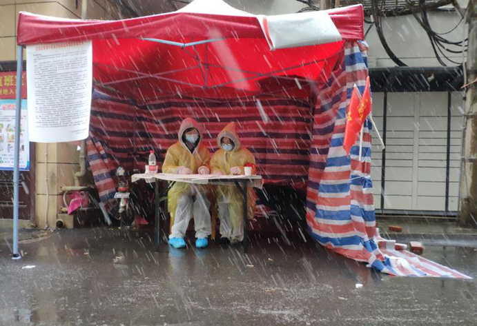 在值守中,由于风力太大,临时雨棚被掀翻,大家只能躲在屋檐下继续坚守。中午开始下起了大雪,突击队员们虽穿着雨衣,衣服鞋子还是全被打湿,午餐也是自备的干粮。即便刮风下雪,突击队员对人员登记、体温测量等工作也仍旧一丝不苟。