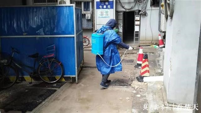 报名后第二天,51岁的张小刚便跟随所在的突击队迅速投入到支援社区的工作中。根据安排,他所在的小分队对口支援江汉区唐家墩街八古墩社区中百宿舍。该小区多年来缺乏物业管理,小区基础设施差、环境卫生不理想,张小刚主动承担起繁重的消毒工作,背上近40斤的消毒桶,爬7层楼的楼梯,逐栋进行消毒,为年轻队友做出了表率。