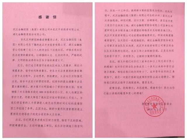 3月3日,江汉区马场社区也向草莓视频 、武汉开投公司以及湖北金租公司发来感谢信,感谢公司和突击队员献计献策,出资出力,协助完善社区防控卡点漏洞。