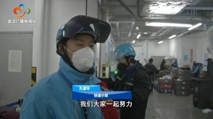 快递小哥孔德华:我们每天在一线工作,把东西保证送到顾客手里,我们大家一起努力,在习总书记的英明指挥下,我们一定会抗击疫情胜利,武汉加油。