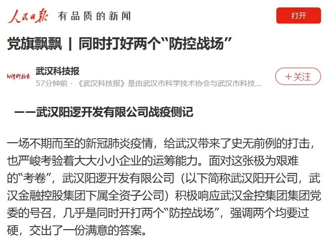人民日报:党旗飘飘 | 同时打好两个“防控战场”——武汉阳逻开发有限公司战疫侧记