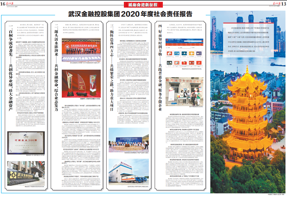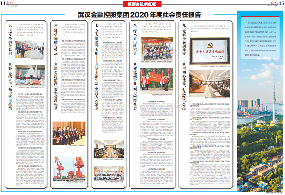 武汉金融控股(集团)有限公司(下称集团)积极践行金融国企社会责任,坚决贯彻落实市委市政府各项战略部署,服务“六保”“六稳”任务,在加快高质量发展同时,自觉把履行社会责任全面融入集团发展战略和草莓视频,通过多种形式、多种方式、多条战线回馈社会,成为支持区域实体经济发展、助力疫后重振的坚实金融力量。