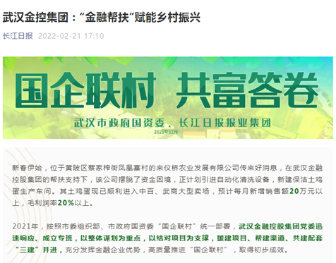2021年,按照市委组织部、市政府国资委“国企联村”统一部署,武汉金融控股集团党委迅速响应、成立专班,以整体谋划为重点,以结对项目为支撑,援建项目、帮建渠道、共建配套“三建”并进,充分发挥金融企业优势,高质量推进“国企联村”,取得初步成效。