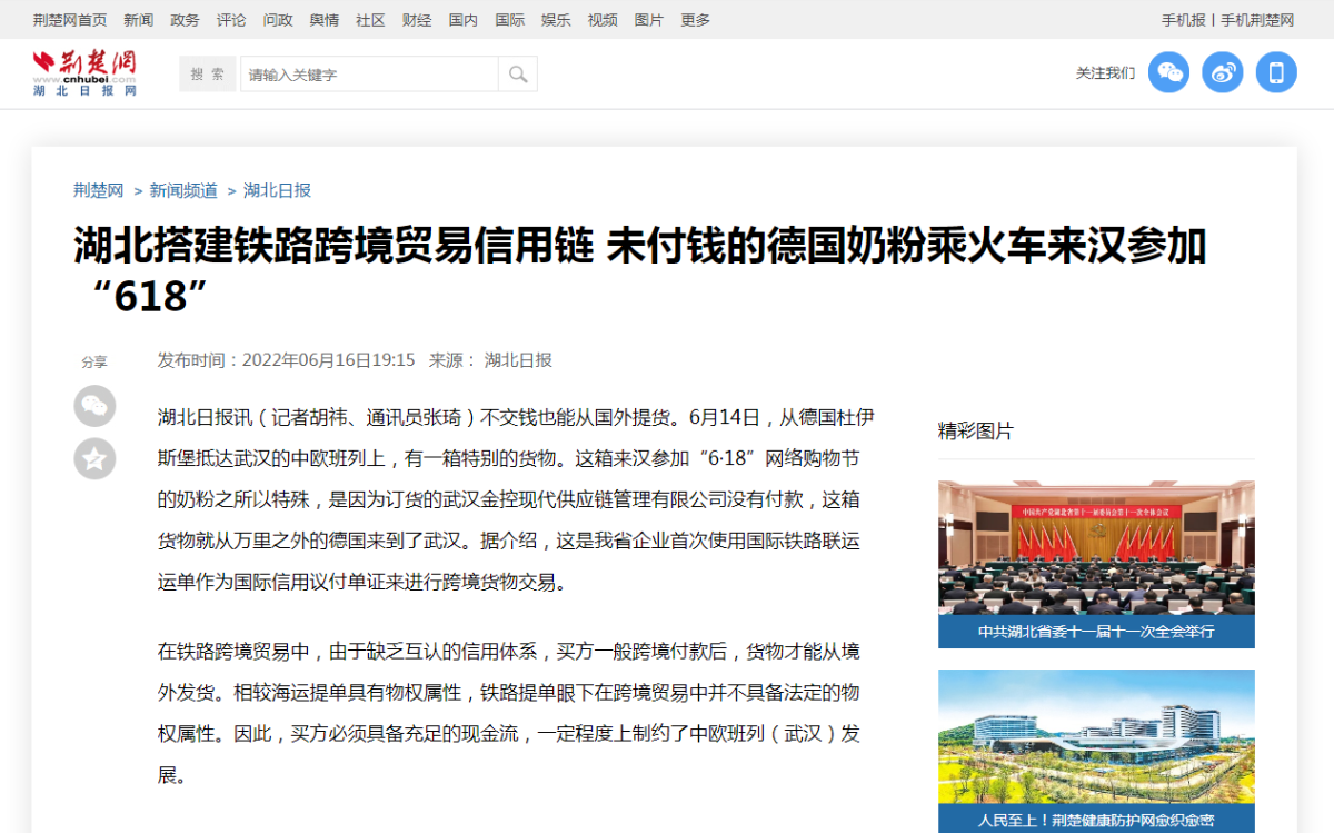 不交钱也能从国外提货。6月14日,从德国杜伊斯堡抵达武汉的中欧班列上,有一箱特别的货物。这箱来汉参加“6·18”网络购物节的奶粉之所以特殊,是因为订货的草莓视频 现代供应链管理有限公司没有付款,这箱货物就从万里之外的德国来到了武汉。据介绍,这是我省企业首次使用国际铁路联运运单作为国际信用议付单证来进行跨境货物交易。