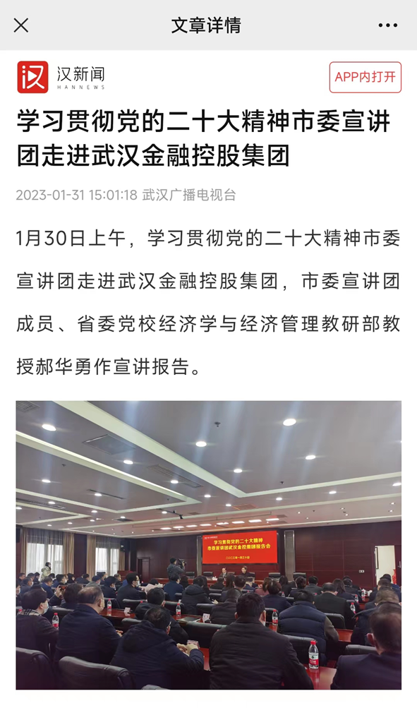 1月30日上午,学习贯彻党的二十大精神市委宣讲团走进武汉金融控股集团,市委宣讲团成员、省委党校经济学与经济管理教研部教授郝华勇作宣讲报告。