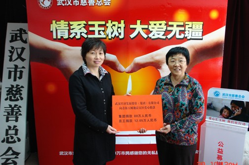 2010年4月29日上午,受集团公司党委书记、董事长马小援同志委托,集团公司党委副书记、工会主席王晨冰同志将上述捐款92万多元捐赠给武汉市慈善总会,为玉树地震灾区人民奉献一片爱心。
